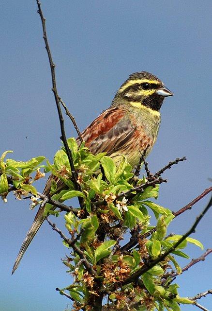 In spring, males have a striking black chin, eye stripe and crown and yellow stripes on head and yellow underparts. Female and juveniles look similar to yellowhammers, but have bolder head markings and streaked grey/brown rumps. It is a Schedule 1 species.